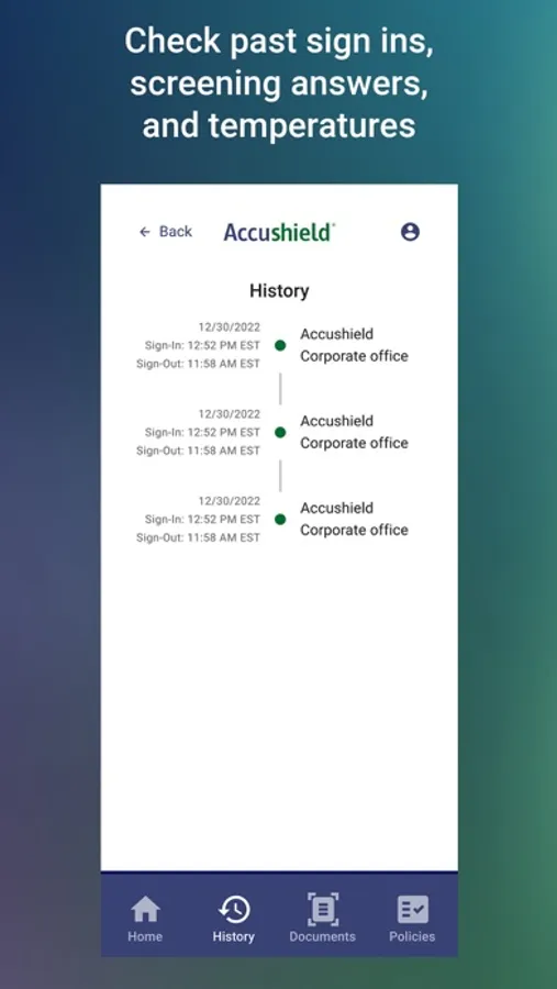 Accushield Mobile works with the Accushield Kiosk to enable a fast, touchless sign-in and screening experience at senior living communities and skilled nursing facilities. This version of the app is designed specifically for staff member, healthcare/service provider and family/guest sign in/sign out. If you need technical assistance with signup, please contact your senior living community or skilled nursing facility.