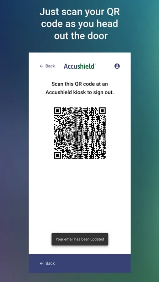 - When you arrive at the Accushield Kiosk, scan your mobile QR code to sign in, scan your temperature at the kiosk, and print a name badge all without having to touch the kiosk screen.