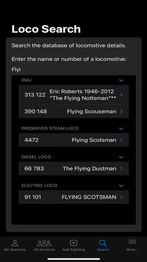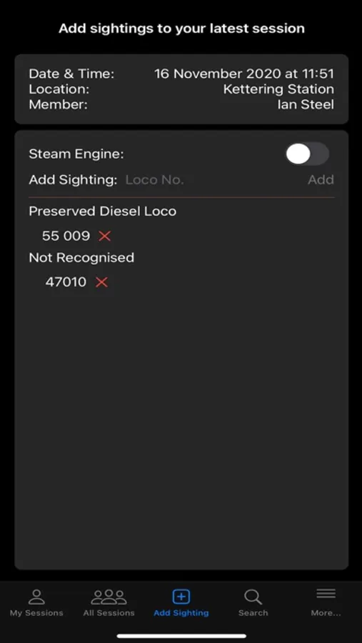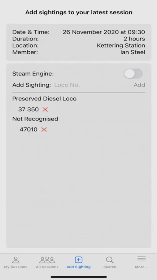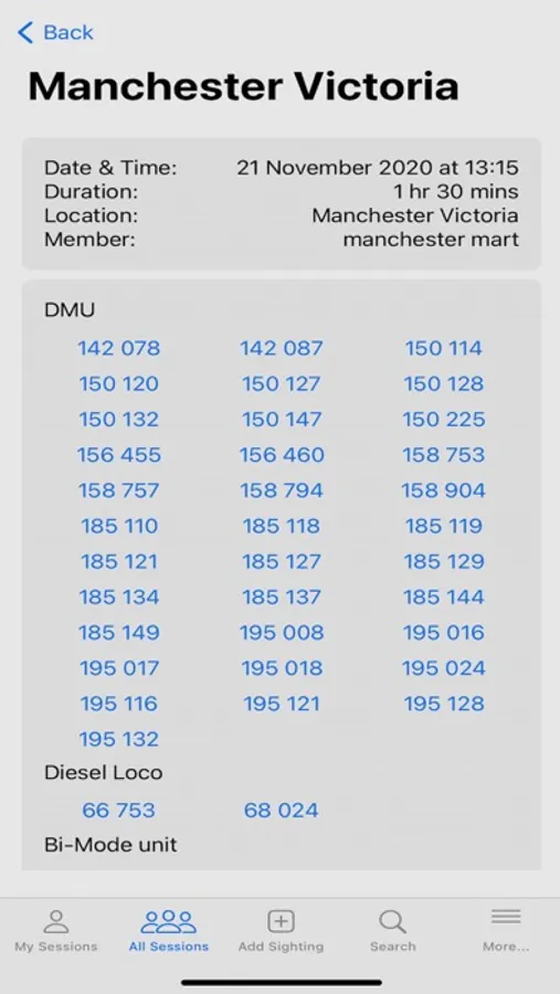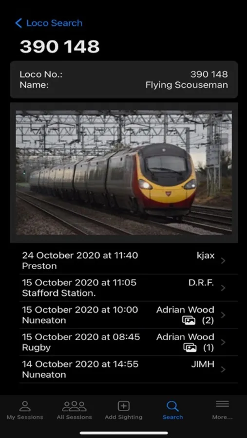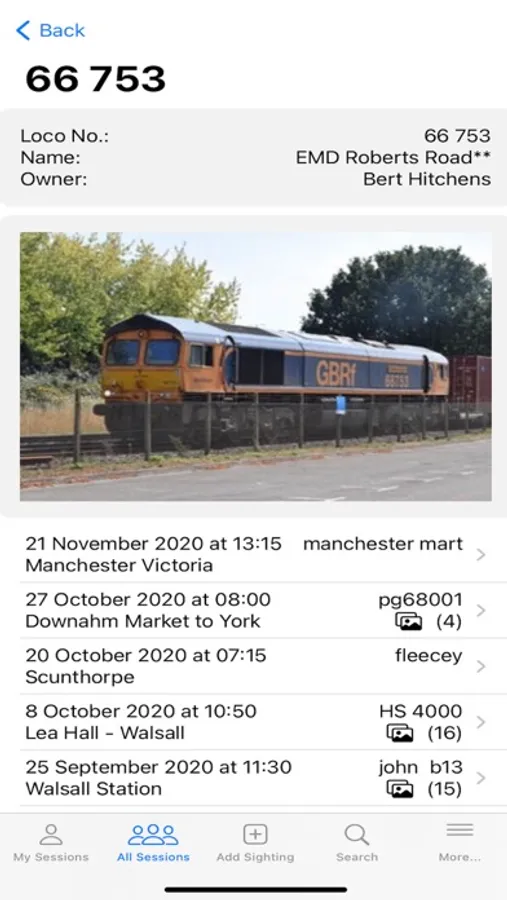 View sessions and sightings recorded by other members along with photographs of individual locomotives.