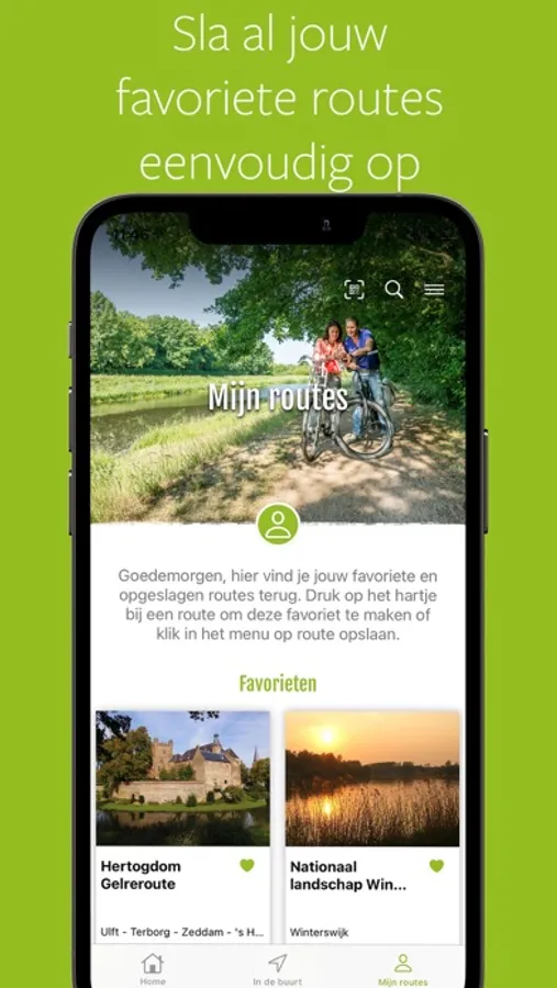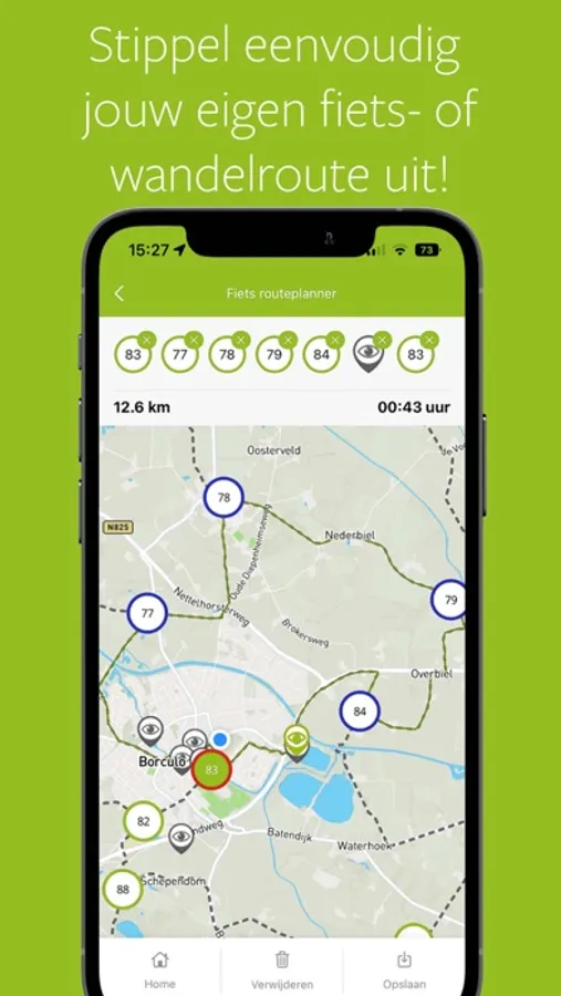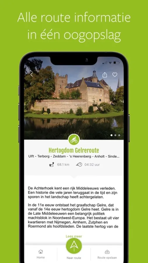 Je kunt in de app op zoek naar routes die aan al jouw wensen voldoen aan de hand van filters en een zoekfunctie. Ook kun je eenvoudig kijken welke routes bij jou in de buurt liggen zodat je direct op pad kunt gaan. Door op een route te klikken zie je direct alle informatie over de route zoals afstand, duur, plaatsen waar de route door heen kom en leuke tips voor onderweg. Ook kun je de route opslaan als favoriet en downloaden voor offline gebruik mocht je de route op een later tijdstip nog een keer willen volgen. Liever een eigen fiets- of wandelroute uitstippelen? Dit kan met de routeplanner.