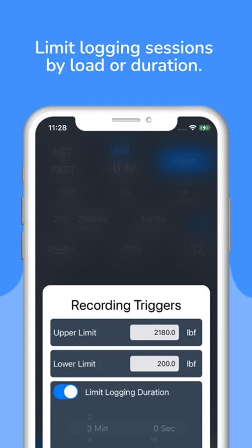 - Define optional upper, lower, and duration limits for recorded data