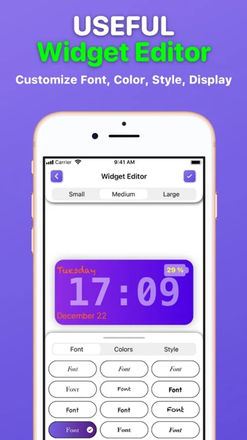 ■ Widget Editor – edit custom widgets as you like. Customize Font, Color, Style, Display (Date, Time, Day, Battery).