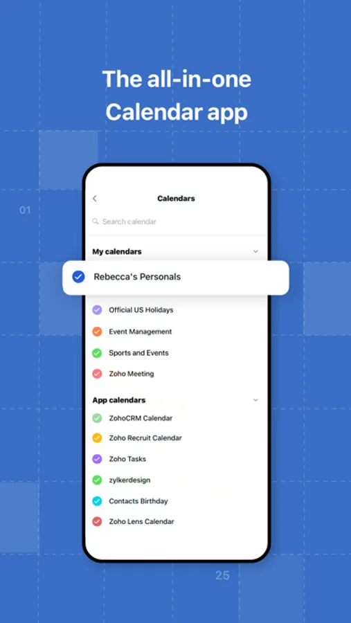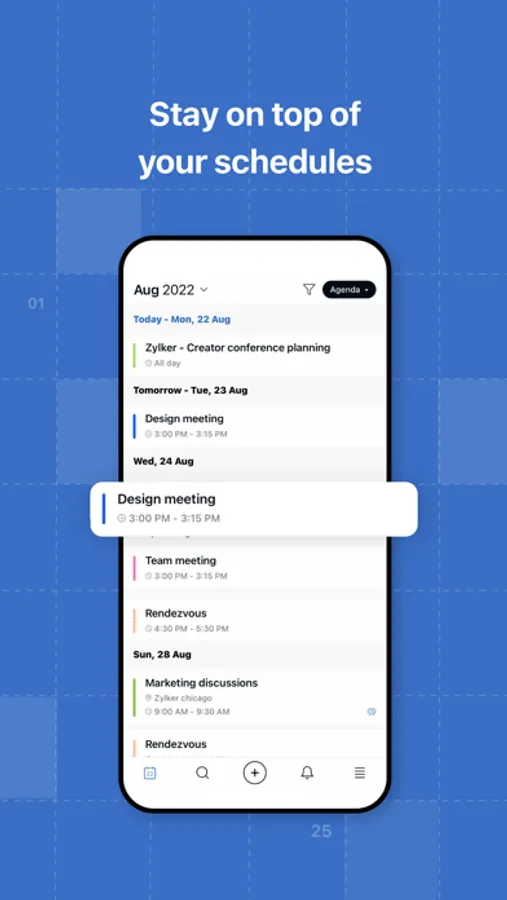 Forget about jumping between different apps to manage your schedules. Zoho brings them all under one roof, be it your personal calendar, group calendars, shared calendars or calendars across other Zoho apps.