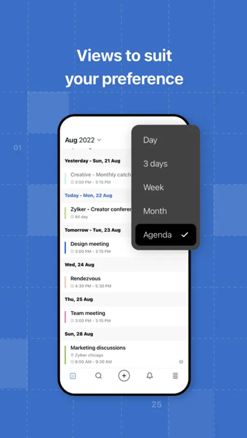 Zoho Calendar comes with different views to suit our diverse users. Choose from the Day, 3-Day, Weekly, Monthly, or Agenda views, according to the need at hand. You can also change an event's time by simply dragging and dropping the event in the day or week views.