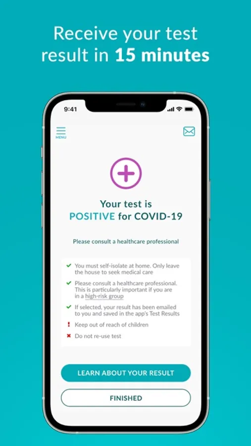 The Ellume COVID-19 Home Test App guides you step-by-step through using the COVID-19 Home Test kit (purchased separately). It will help you understand your result, know what steps to take next, and allow you to share your test result with your healthcare professional or employer.