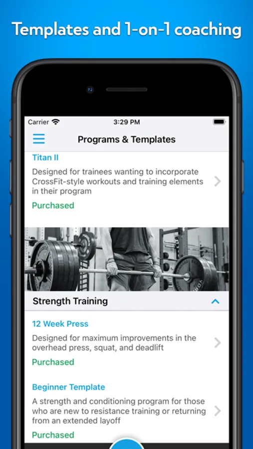 Through the app, users can access all of Barbell Medicine's free training templates, like The Bridge, The Beginner Prescription, the Peaking Templates, and the Free Strongman Template along with their associated e-books.