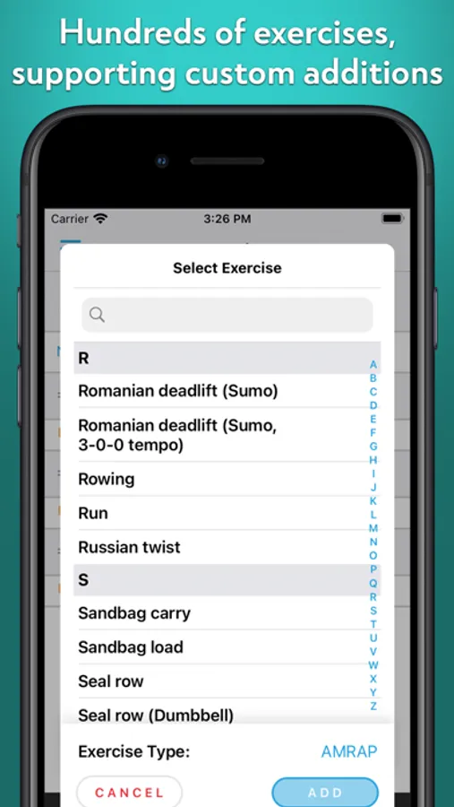 • Exercise selection, with over 1,000 built-in exercises to choose from