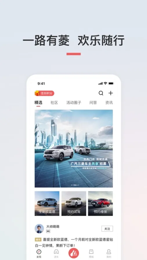广汽三菱APP是广汽三菱用户交流的官方平台,在这里您可以与志同道合的菱友们一起获取最新的广汽三菱新闻资讯,参与官方/销售店举办的互动活动、用积分兑换各类文创潮品、分享用车心得及生活感悟等。贴心的服务功能、便捷的浏览方式、最火的话题动态以及最新最全的资讯内容,只为给您提供更加美好的用车生活,共享驾驭探索之趣。