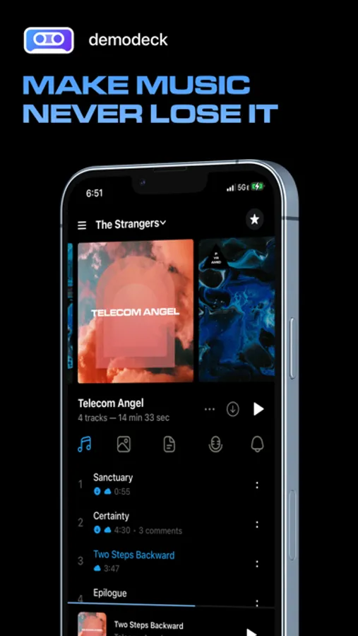 Demodeck is the best app to keep your demos, lyrics, and ideas all in one place with secure backup to the cloud. With Demodeck, musicians and producers can easily playback their music, stay organized, share with friends, and collaborate with their band while on the go.