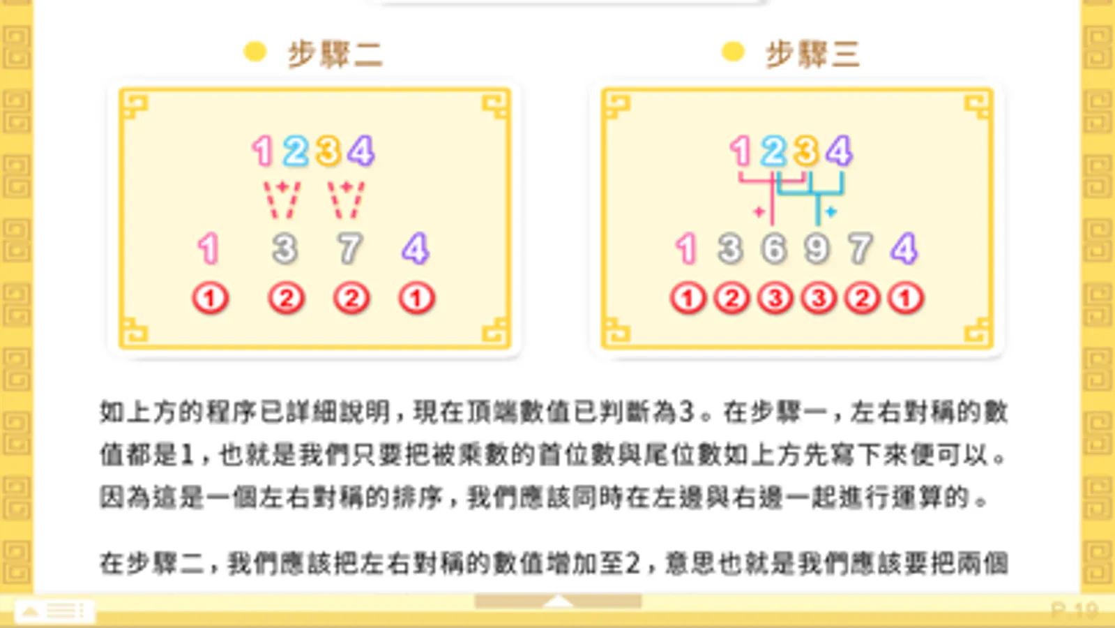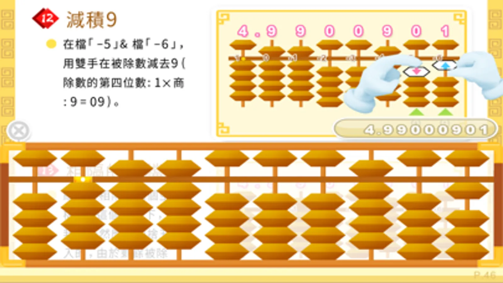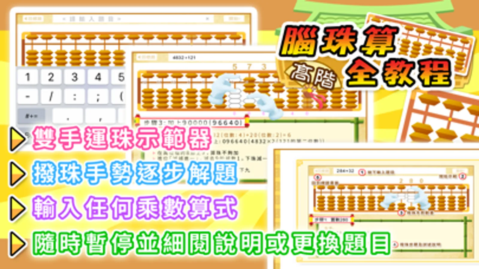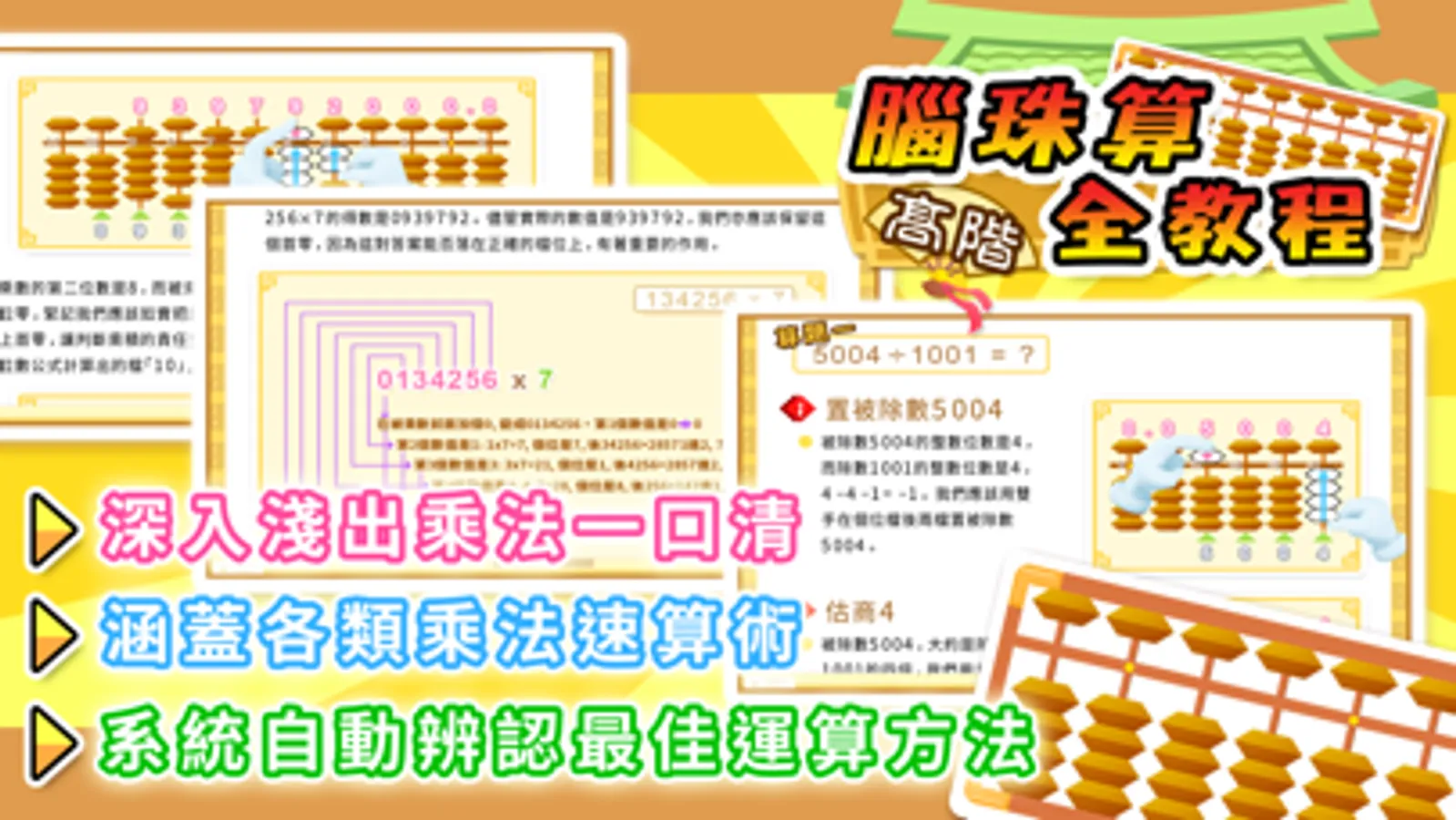 「腦珠算全教程(高階)」聚焦乘法速算術,乘除法高階課題探討及負數運算,內容劃分成兩個部分,分別是教程與雙手運珠解題示範器,介面設計好學易懂。