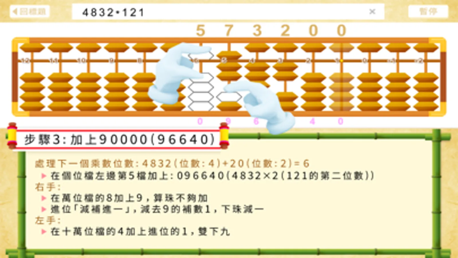 配合模擬算盤以便我們可以在任何時間開始進行運算,課堂內建的模擬算盤讓大家可以隨時跟隨課堂,在算盤上同時練習雙手運珠的方法。大家既可以按照頁面的圖解步驟同步運算,也可先行嘗試運算一次,然後再與對應的示範步驟互相核對。