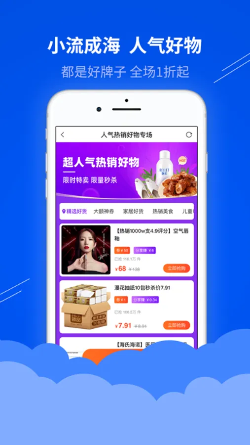 小流成海是一款电商导购应用,为用户打造一个电商购物优惠平台,用户可以在App中获取主流商城的隐藏优惠券。