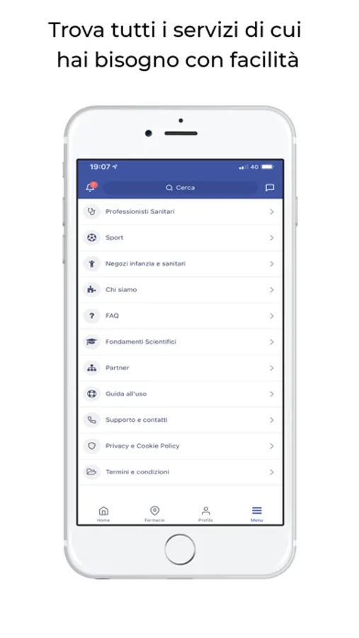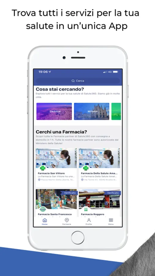 Per la tua salute i servizi giusti. Salute360 è la prima app per la tua salute veramente completa. Dalla consegna a domicilio dei farmaci e di tutti i prodotti acquistabili in farmacia alle visite mediche. Un unico sistema per trovare tutto quello di cui hai bisogno.