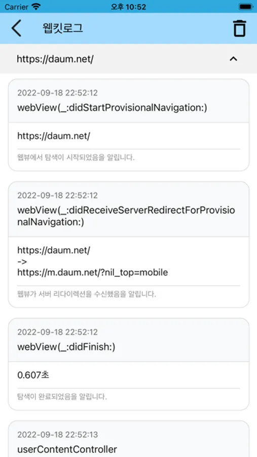 ㅇ 웹킷로그 기록 : 웹킷 함수 호출을 확인할 수 있습니다