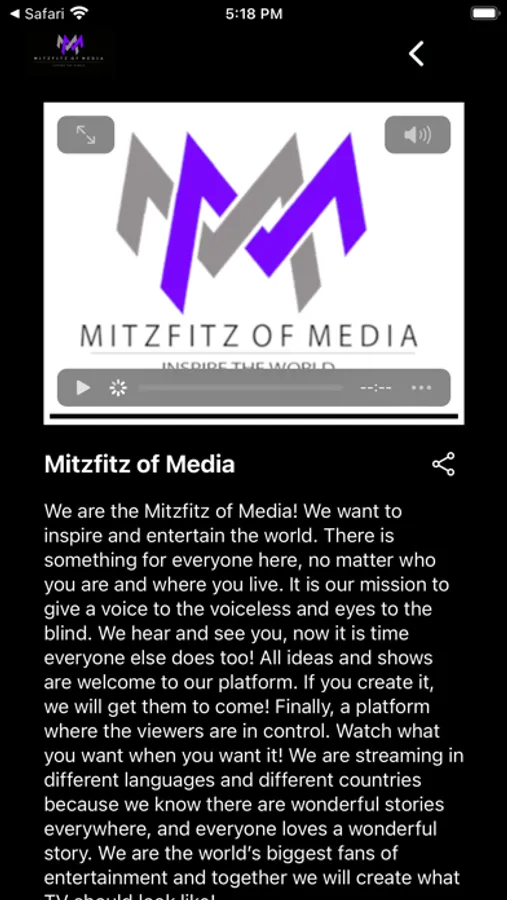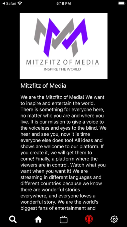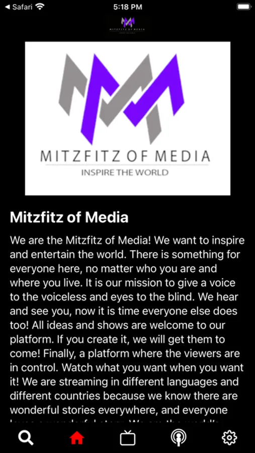We are the Mitzfitz of Media! We want to inspire and entertain the world. There is something for everyone here, no matter who you are and where you live. It is our mission to give a voice to the voiceless and eyes to the blind. We hear and see you, now it is time everyone else does too! All ideas and shows are welcome to our platform. If you create it, we will get them to come! Finally, a platform where the viewers are in control. Watch what you want when you want it! We are streaming in different languages and different countries because we know there are wonderful stories everywhere, and everyone loves a wonderful story. We are the world's biggest fans of entertainment and together we will create what TV should look like!