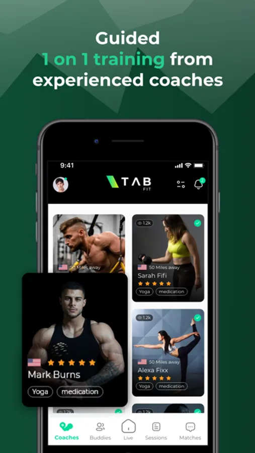 TAB Fit matches you with personal trainers and workout buddies based on your user profile and behaviors within the platform, ensuring a more effective workout experience today and creating a fitness connection for the future. Using real-time location and fitness buddy matching logic, TAB connects you with the fitness buddies you are most compatible with and allows you to view personal trainers at a price you can afford.