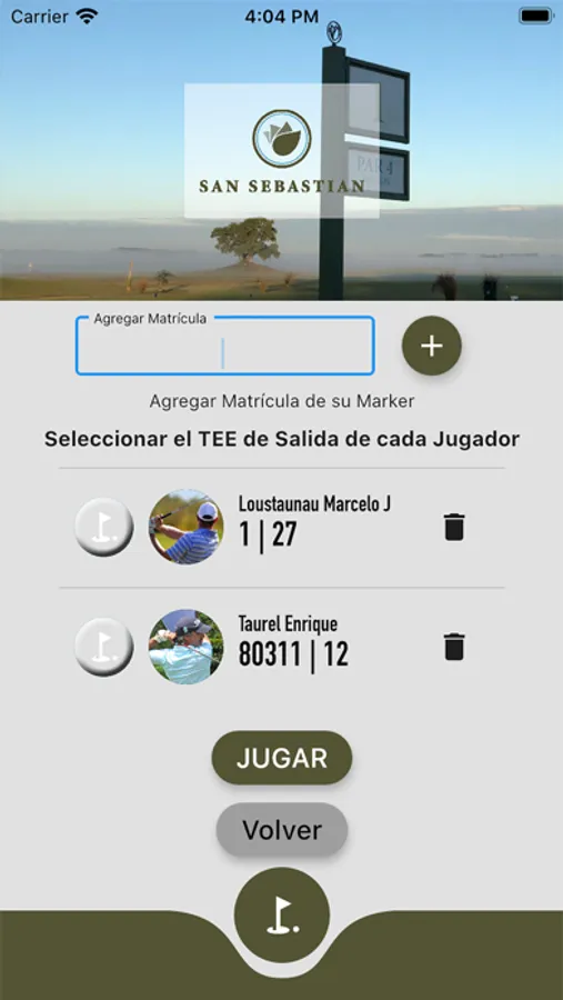 Ambas opciones acceden al menu Agregar Jugador, donde ingresara la matricula de su compañero de juego y seleccionara el tee de salida de cada uno.