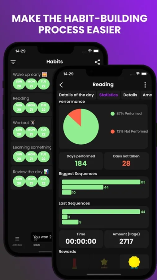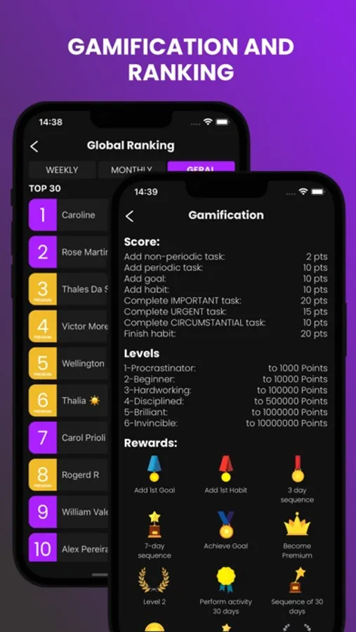Our app uses gamification to motivate you to follow your defined routine. By carrying out your activities, you add points and participate in the weekly, monthly and annual rankings. By acquiring points, you reach higher levels. Also, get rewards for completing your goals, and performing habits for a certain consecutive sequence.