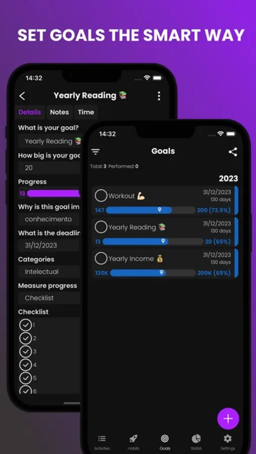 Set goals efficiently with the SMART method. Associate tasks and habits with your goal and see statistics on your goal-related activities. Choose the best way to measure goal progress: Manual, Checklist or relate to achieving a habit. Use timer, timer to work focused on your goal. Add daily notes to your goals.