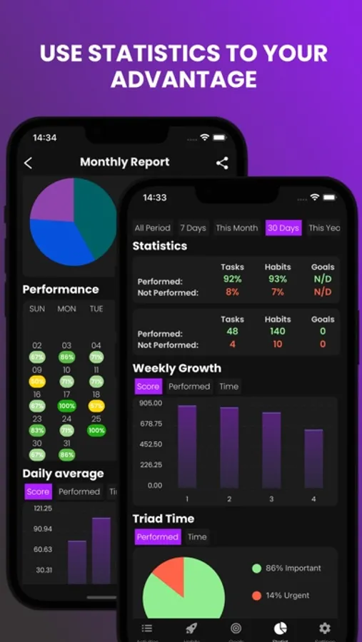Gain valuable insights into your performance. Track statistics about each habit and task, view the percentage of activities performed, graphs referring to your Triad of Time and Wheel of Life. In addition, access complete reports in different periods: daily, weekly, monthly and yearly.
