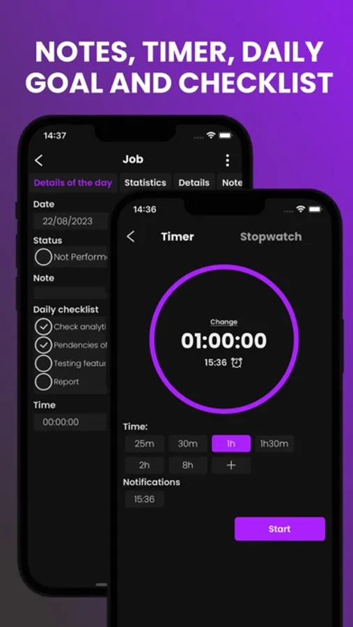 Use the Timer & Stopwatch to stay focused on your tasks, habits and goals and measure the time spent on each activity. Plus, see weekly, monthly, and yearly graphs of time spent on each activity.