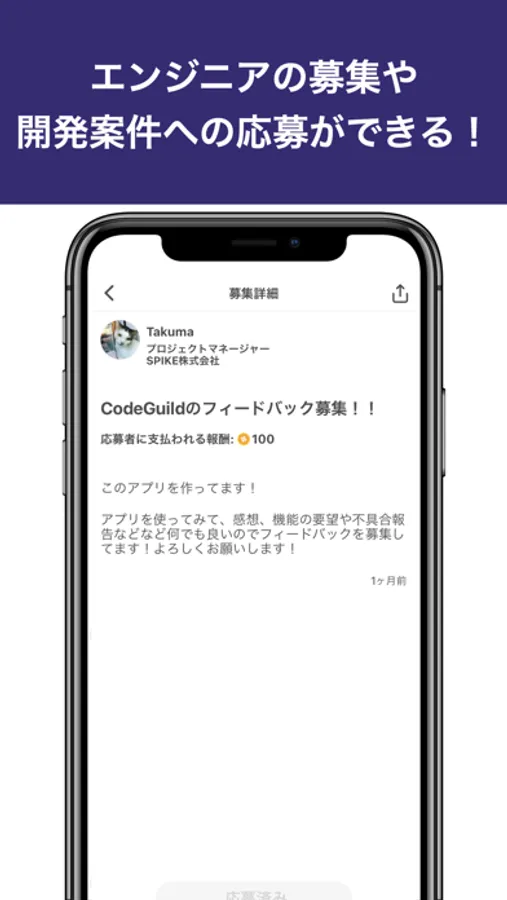 「CodeGuild(コードギルド)」は、エンジニア仲間や開発案件に出会えるエンジニアのためのSNSアプリです。