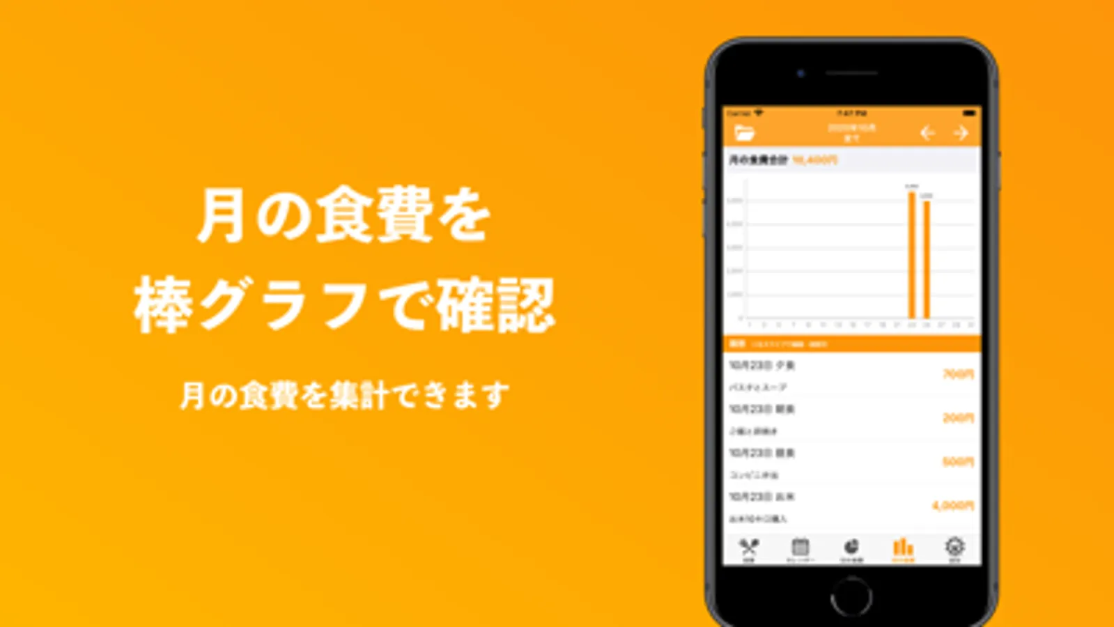 ・月の食費を棒グラフで表示します。