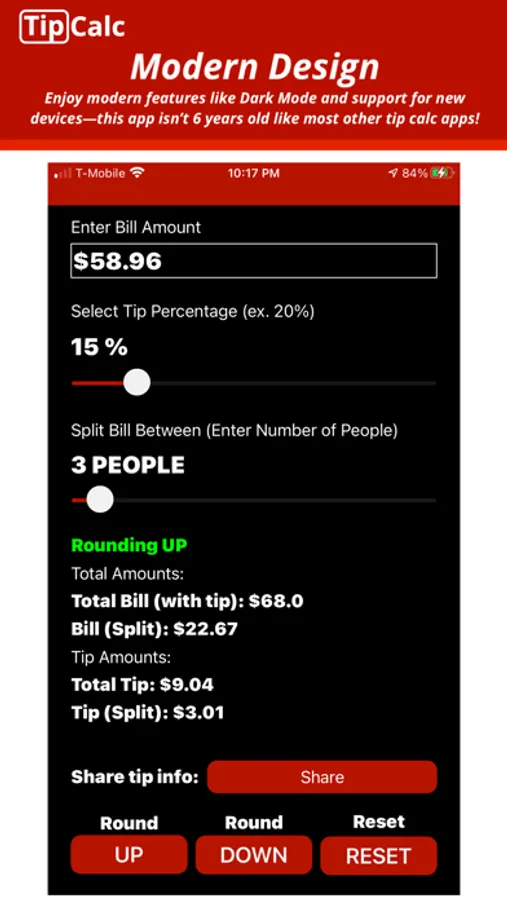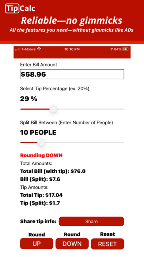 TipCalc is a simple tip calculator app that has the ability to calculate tips, round the total, account for multiple people to split the bill, and share the calculations. The app uses a minimalistic and simple design and supports all the new iOS devices. Unlike most other tip calculating apps, this app is constantly updated—it's not six years old! Also, this app is not as costly as other apps for the version without ads and also supports family sharing, so you can get it on all your family's devices at no extra cost. This is by far the best tip calculating app, so download it today!