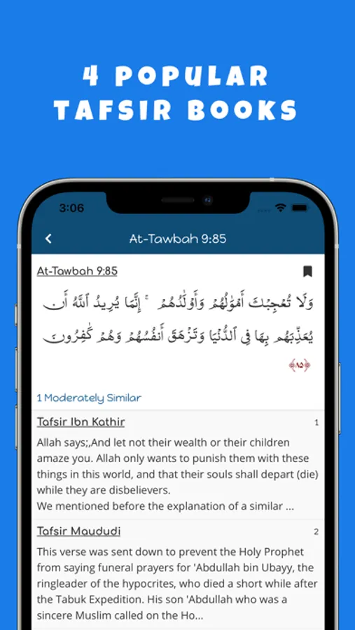 - see the English tafsir alongside each Quranic verse in 4 popular tafsir books (Ibn Kathir, Maududi, Asbab Annuzul, and Maariful Quran)