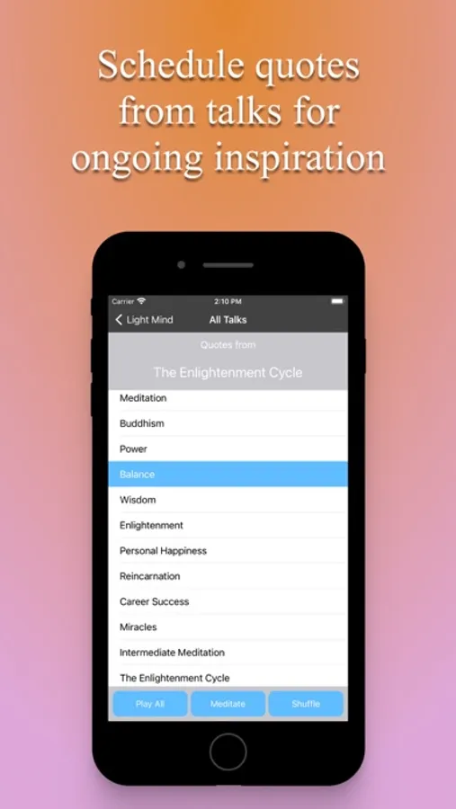 d. Search – find quotes by searching a word, for example, love, strength, etc., then play all in sequence, shuffled, or as a guided meditation