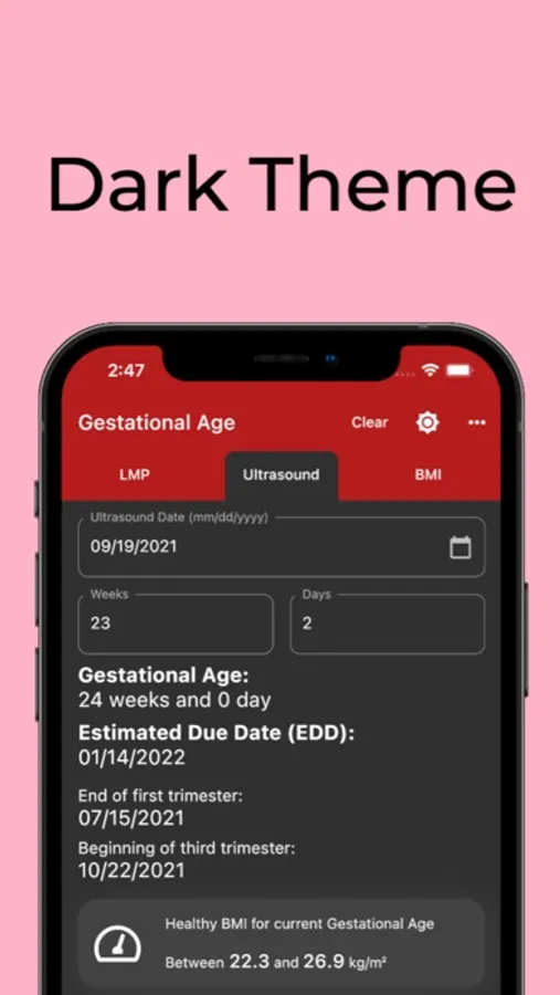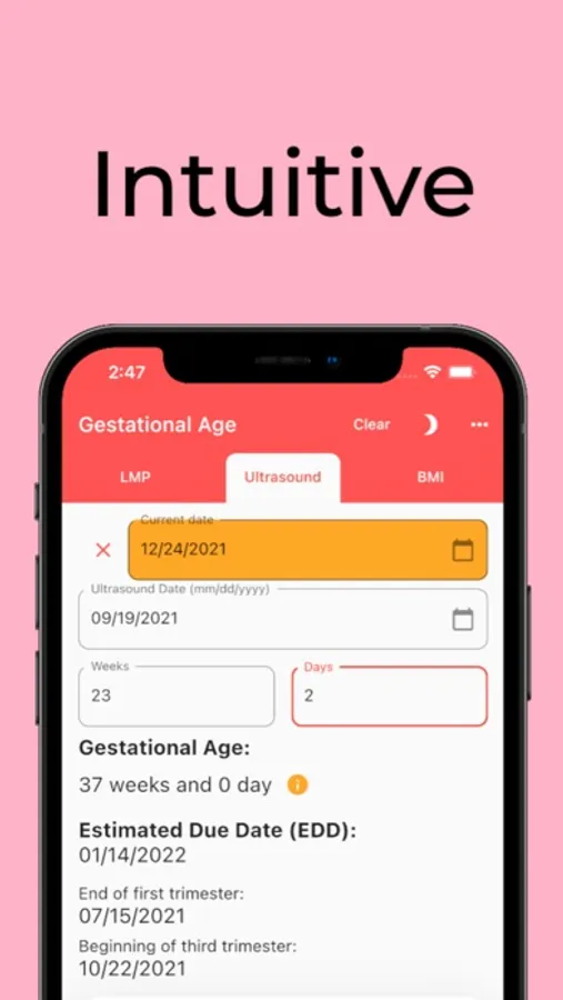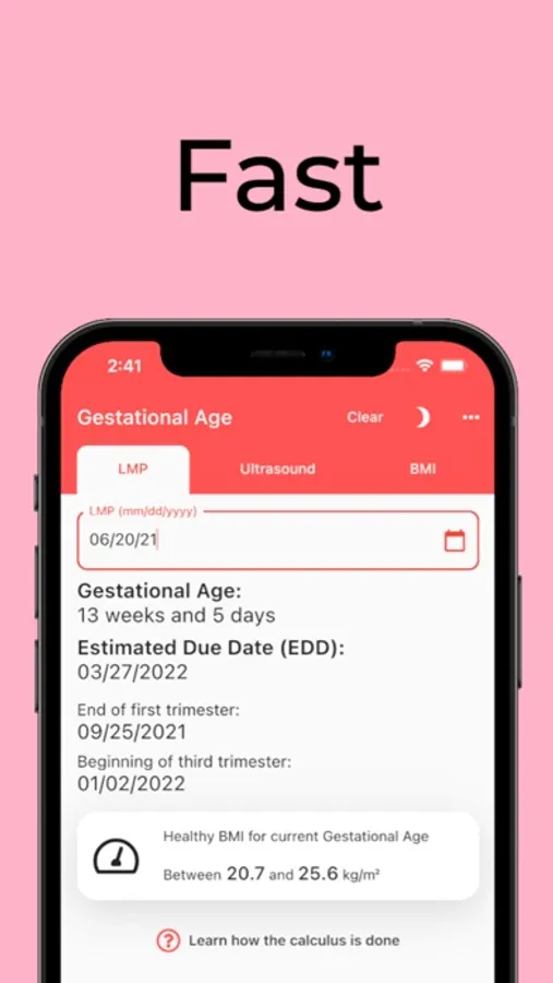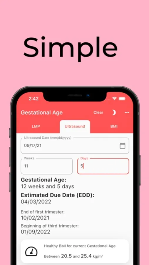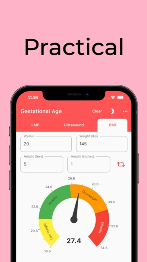 The app features a practical and intuitive gestational BMI calculator, essential for the weight management of the pregnant women. BMI recommendation changes as the gestational age increases.