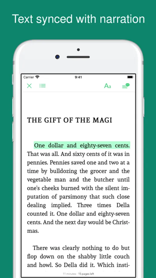 - Read-along feature: highlighted text synced with human narration