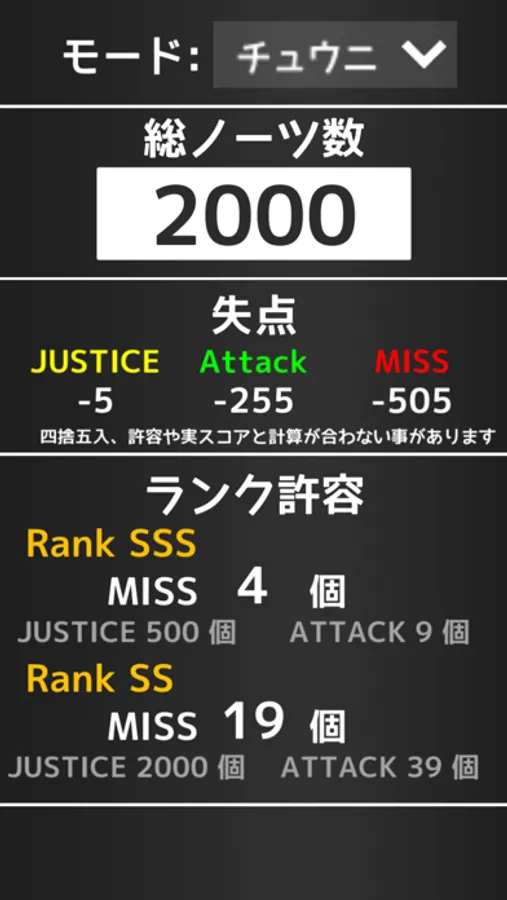 音ゲーの許容ミス数や1ミスあたりの失点をノーツ数を入力するだけで即時に計算!