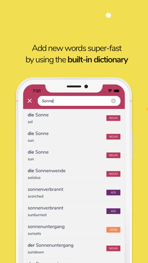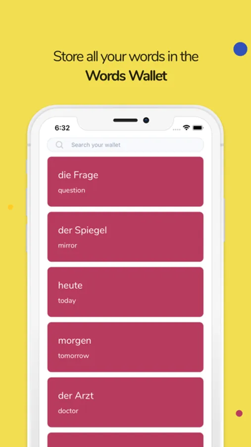 The app doesn't require any Internet connection, since the words are stored in the internal dictionary. Adding a new word to your wallet takes just a few seconds and you will be in full control of what to learn.