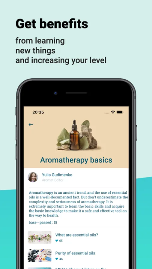 In the application you will find information about the most popular essential oils, such as lemon oil, peppermint oil, lavender oil and tea tree oil, but also about quite rare oils like rose oil, Siberian fir oil, frankincense oil and sandalwood oil and many others. We are constantly working on improving and supplementing information about oils, training courses and news.