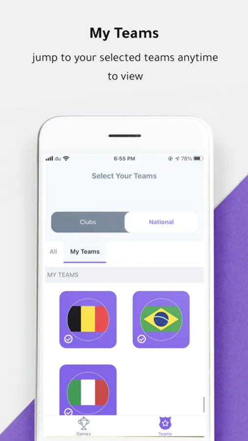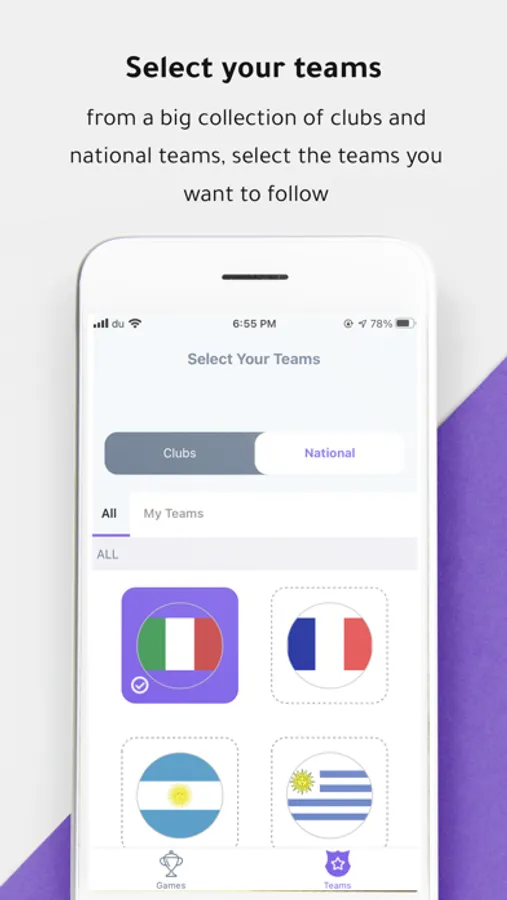 1- Select/Deselect favorite teams among Clubs and National Teams