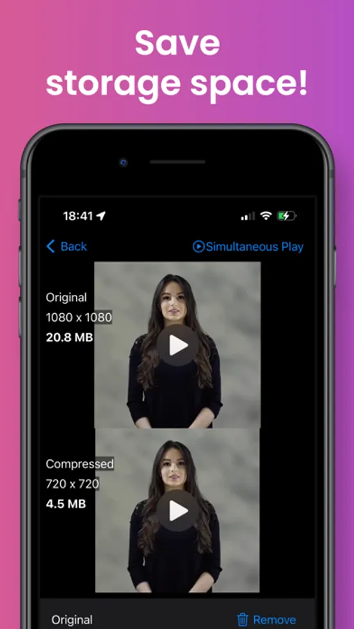 You can compare the pre- and post-compression videos on a single screen, so you can check the video's quality before deleting it without any worries.