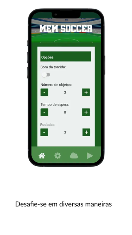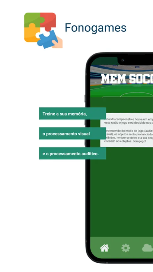 Jogo lúdico com o tema futebol para trabalhar a memória, estimular o processamento auditivo e o visual. É possível habilitar ou desativar o som da torcida (ruído), escolher quantos objetos a serem memorizados, quantas rodadas terá o jogo e adicionar tempo de espera entre a memorização dos objetos e o jogo.