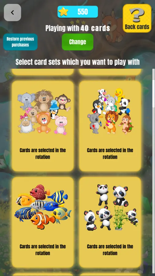 There is an option to play with 12, 24, 40 or 60 cards. You can also choose from different back card designs to play with what you like the most. Thanks to all those options, wonderfull cards, effects, simple and intuitive design, game will never get boring and you can look forward to each time you play.