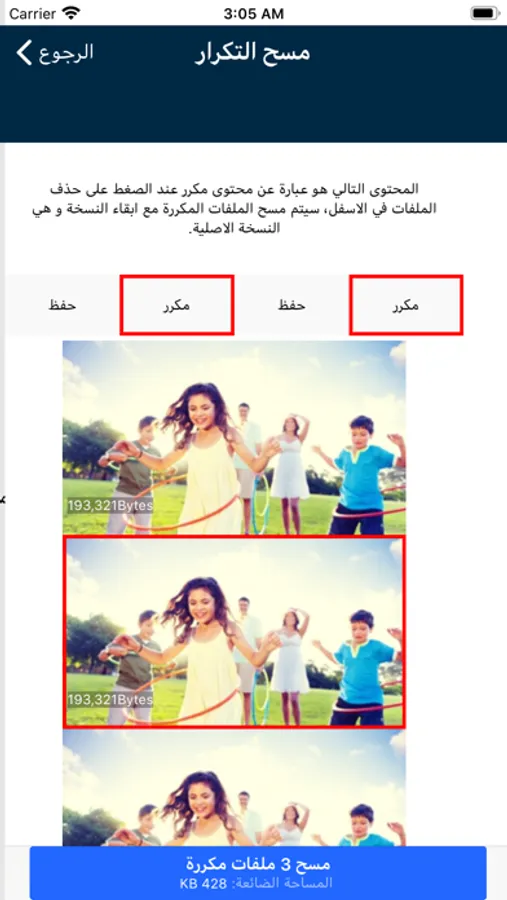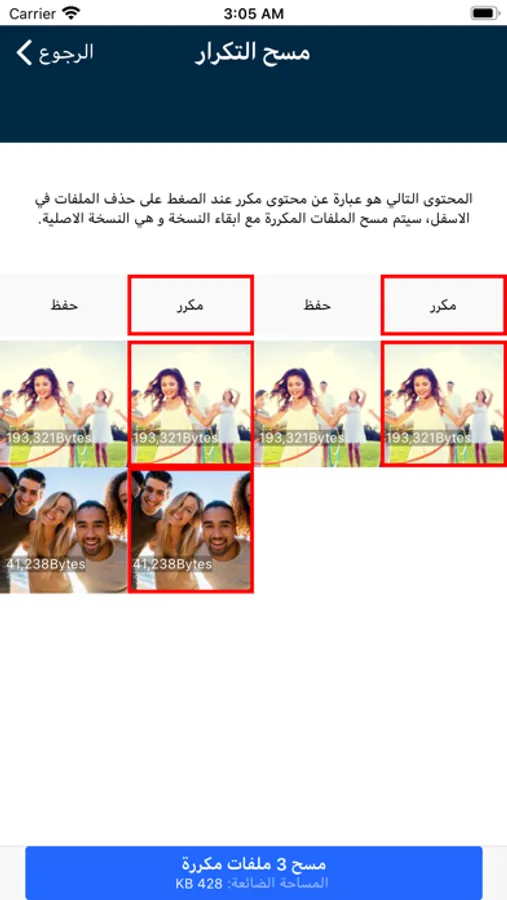 يقوم البرنامج بعرض الصور و الفيديوهات المكررة و اظهار التكرار باللون الاحمر،و اعطائك الخيار لمسح بعض منها او جميعها.