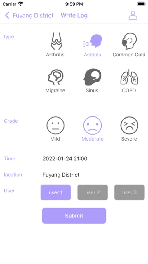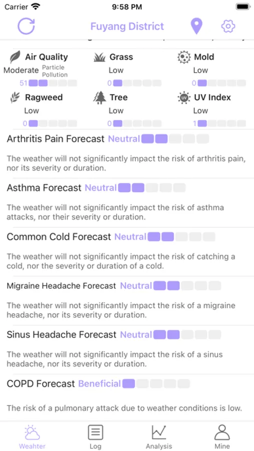 Many people often have headaches or joint pains before rain. Many studies have shown that weather changes can trigger some symptoms. Some weather factors have a similar effect, such as pollen for asthma patients, air pollution for COPD patients,But some factors do have significant individual differences, and each person's tolerance level is also very different. Therefore, it is necessary to log and analyze the weather conditions of symptom. Comprehensive analysis may give a general reference.