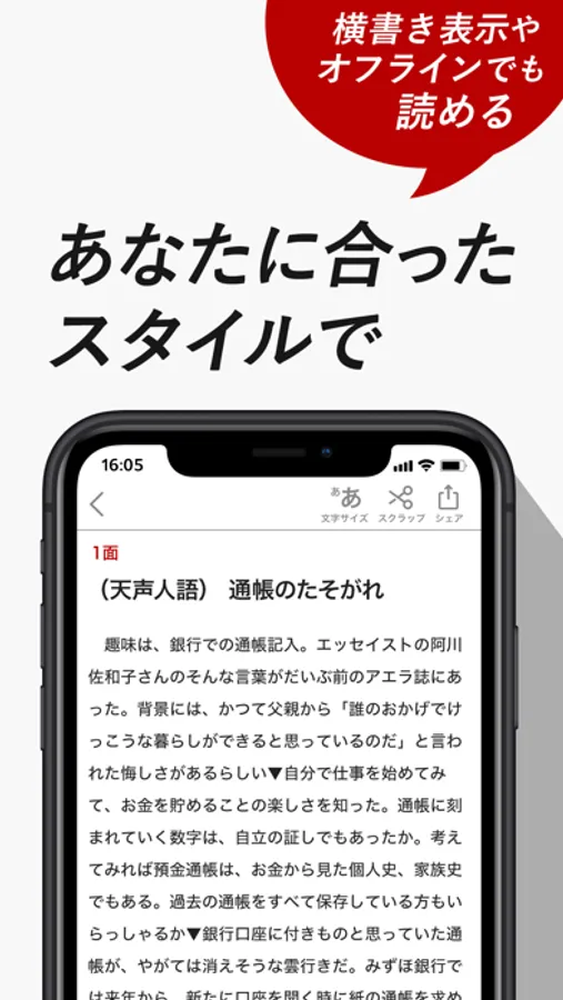 また、文章を横書きで読む「テキスト記事」機能をご利用いただけます。紙面からテキスト記事を開き、読み終えたらまた紙面に戻る、という読み方は、紙面ビューアーアプリだからこそできる体験です(一部の紙面ではご利用できません)。