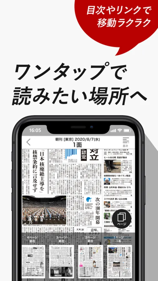 画面右下の「ページ」ボタンを押すと、紙面の各ページのナビゲーションが開き、読みたいページに簡単に移動できます。