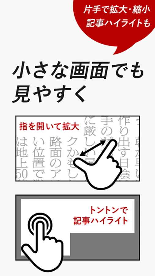2本の指で画面をつまんだり開いたりすると、紙面の表示を縮小・拡大することができます。本文を読むときだけでなく、写真・図表を見るときも便利です。