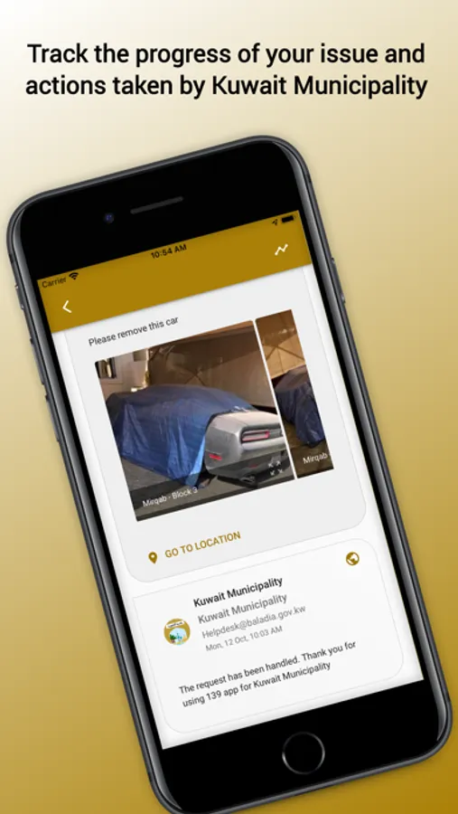 With Baladia 139, reporting an issue is as easy as snapping a photo with your smartphone, adding detailed information and hitting submit. The location of your request will be automatically detected and sent to Kuwait Municipality, so a team can go and handle your request at the earliest.