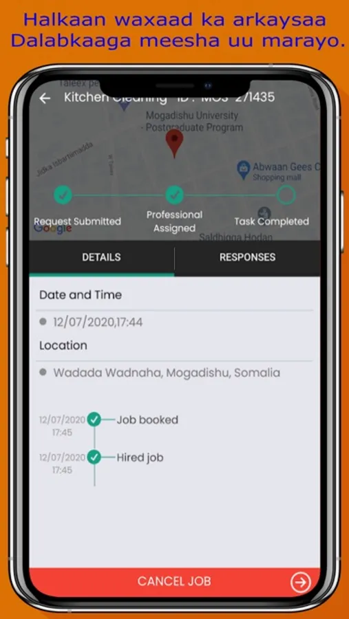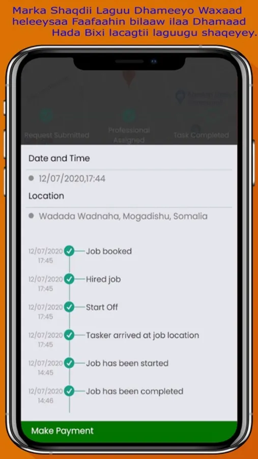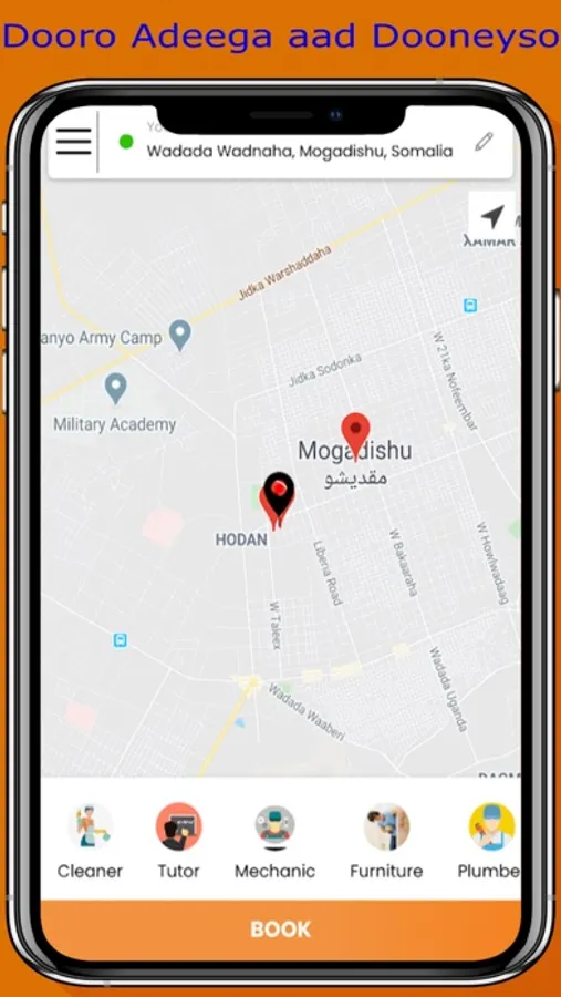 Waxaad riixi doontaa "Ka bood/Skip", kadib waxaa kuusoo bixi doona mapka meesha aad joogto iyo Shaqaalaha kuu dhow kadibna Dooro adeega aad rabto kadibna Riix "Book" kadibna "Confirm" intaa kadib waxaad aadi doontaa Page-ka laga soo login gareeyo App-ka.