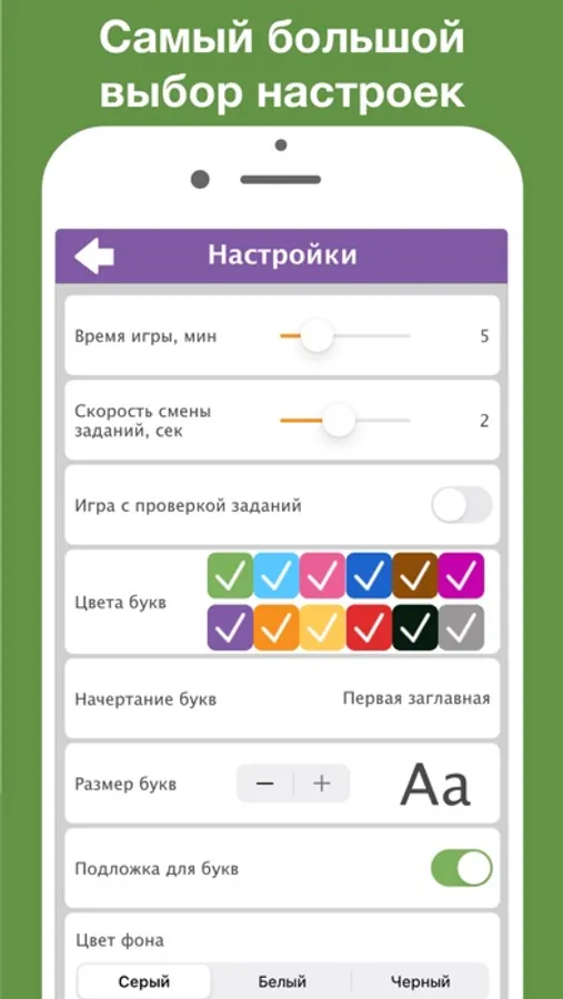 - Цвета букв: 12 цветов