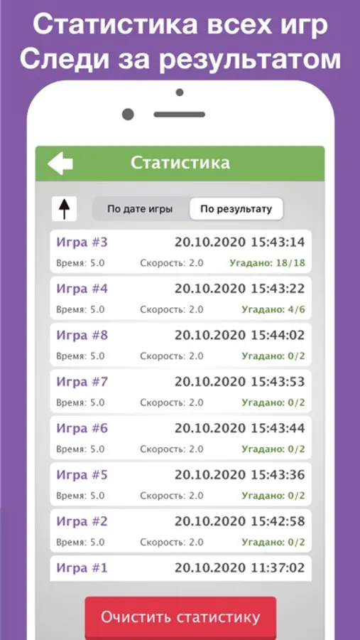 В игре предусмотрена статистика — можно отслеживать даты всех игр, время и скорость каждой игры, а также результат. Игры можно отсортировать по дате или результату, а также очищать статистику в случае необходимости.