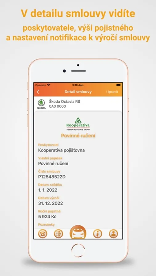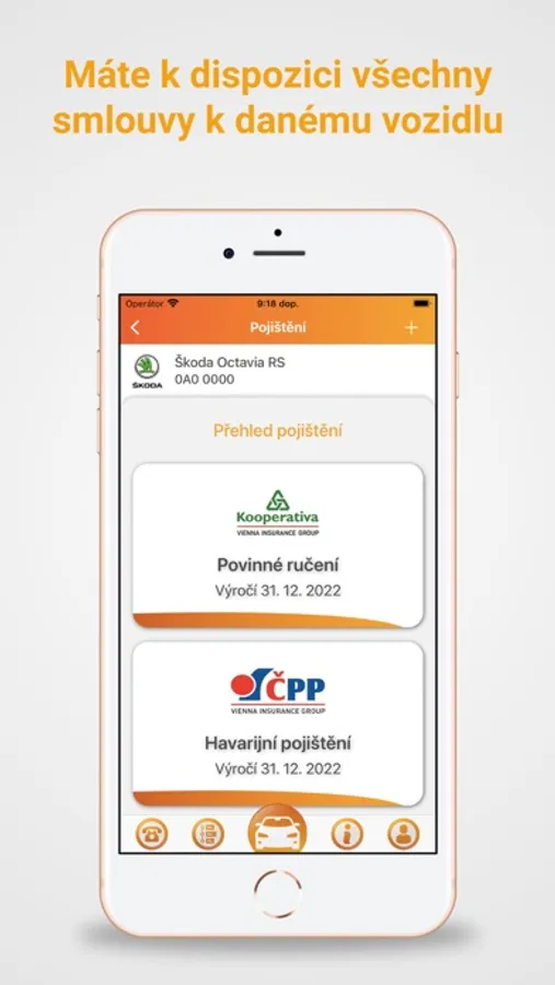 V aplikaci snadno naleznete kontakty na hlášení škodní události a linky pro pomoc řidičům. Navíc přesně víte, jaké pojištění vozidla máte. V detailu smlouvy vidíte infolinku a asistenční linku pojišťovny, u které máte dané pojištění sjednáno. Do aplikace si můžete vložit potřebné dokumenty a mít je tak vždy po ruce.