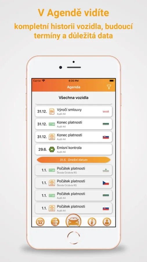 - agenda pro přehled historie vozidla a budoucích důležitých termínů